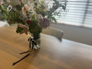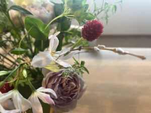 今回はスカビオサ いちごみるくを使いました。可愛いお花ですが、少し弱く、花の頭が下がってしまうことがありますが、一度ブーケから抜いて切り戻しをしてあげるとまたしっかり元気になりました。